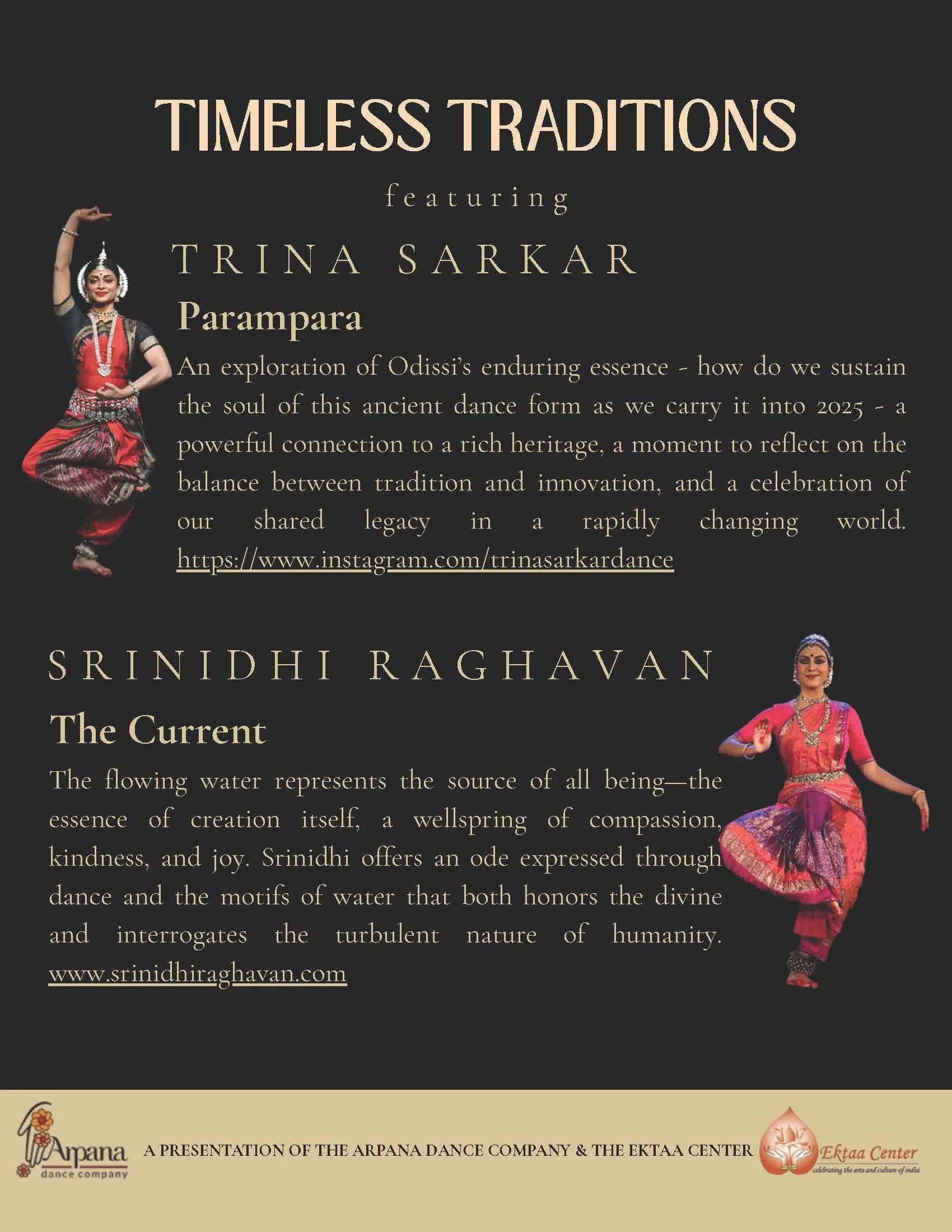 Arpana Dance Company (ADC) envisions its dance practitioners to embody the grace and precision of the Vazvahoor style with the depth and nuances of the emotive language of Abhinaya. Through this unique language they will share both traditional and contemporary stories to audiences of all backgrounds, understandings, and experiences. ADC will groom lifelong enthusiasts and supporters of dance to advance its rich and nuanced lexicon, the glory of its culture and history and the universality of its reach.